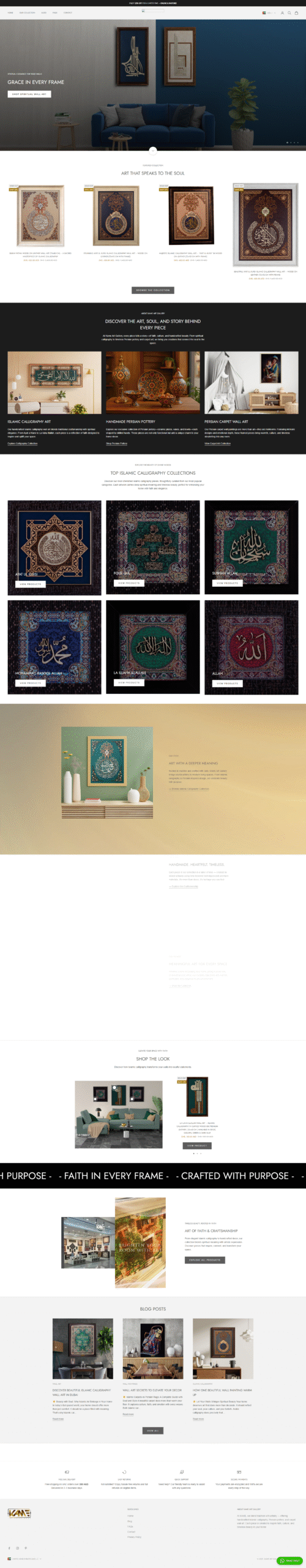 Developed a custom Shopify store for Kame Art Gallery, featuring handcrafted Islamic calligraphy, Persian pottery, and carpet art. Designed for a seamless shopping experience with modern e-commerce functionality and a timeless, faith-inspired aesthetic.