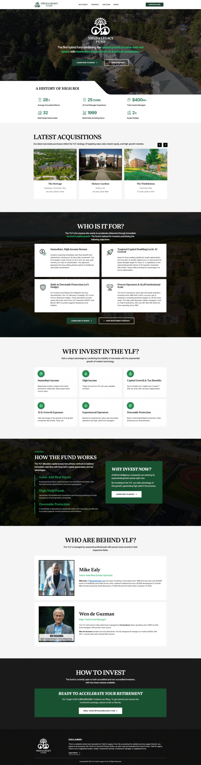 Designed and developed a modern financial services platform focused on helping individuals and businesses build long-term wealth, generate consistent income, and preserve their legacy. The website clearly communicates strategic investment solutions, retirement-focused planning, and wealth optimization approaches through structured service sections and guided user flow. Built with clarity and trust in mind, the platform simplifies complex financial concepts using intuitive navigation, strong messaging, and conversion-focused design positioning Yield & Legacy as a reliable partner for sustainable growth, income generation, and legacy planning.